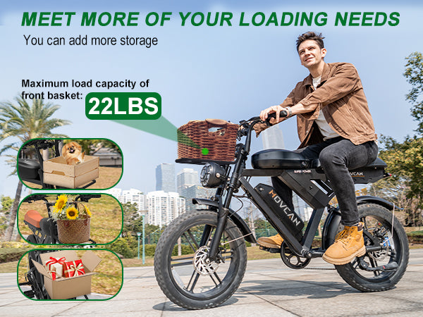 MOVCAN v30 Max electric dirt bike for adults features a spacious front basket with a 22lb capacity, perfect for carrying essentials on your rides. Whether commuting or exploring off-road trails, this electric bike off road ensures you have everything you need within easy reach. The sturdy, well-designed basket adds practicality without compromising performance, making every journey—whether urban or outdoor—more enjoyable and hassle-free.