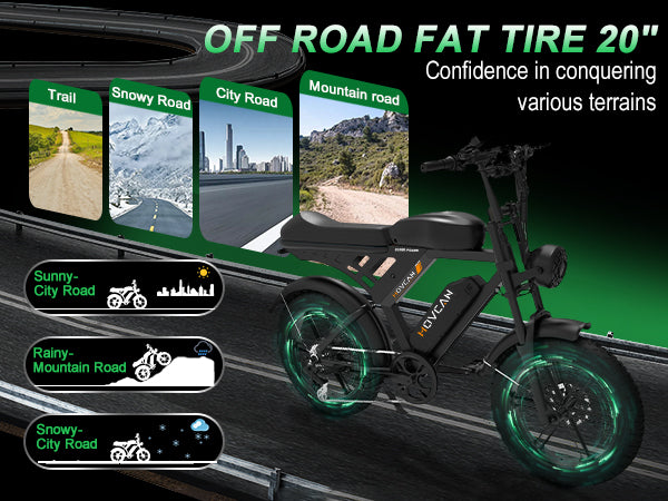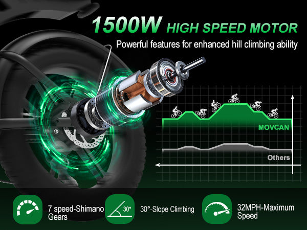 Dual Motor Faster Electric Bikes for Adults MOVCAN e-bike uses dual motor single motor switching mode. With dual motor mode, the peak value can reach up to 3000W and the top speed can reach 37.5MPH.With single motor mode, the peak value can reach up to 1500W and the top speed can reach 31MPH.Just press the switching button, you can enjoy a faster speed experience!
