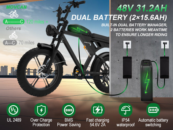 The MOVCAN V30Max eBike features dual 48V 15.6Ah UL-certified batteries delivering 75-mile electric/120-mile PAS range. Its smart system auto-manages power between both removable batteries (6-7hr charge) for uninterrupted commuting or adventures.